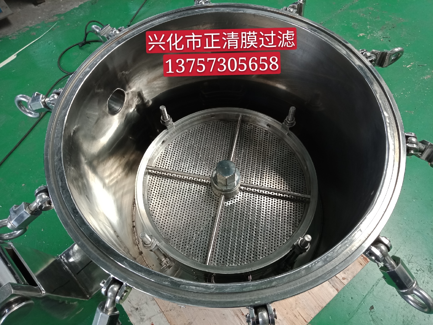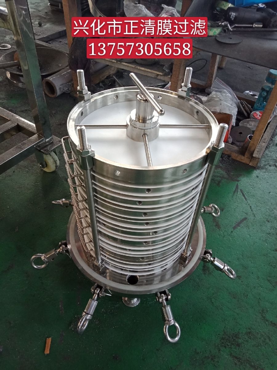 本過濾器采用優質SUS304或SUS316L不銹鋼材料精細加工而成,由清華大學核工部設計,結構緊密,采用雙面網板,可作反沖處理,無殘液,作為膜分離精細過濾,根據流量需要可增加或減少層數等特點。